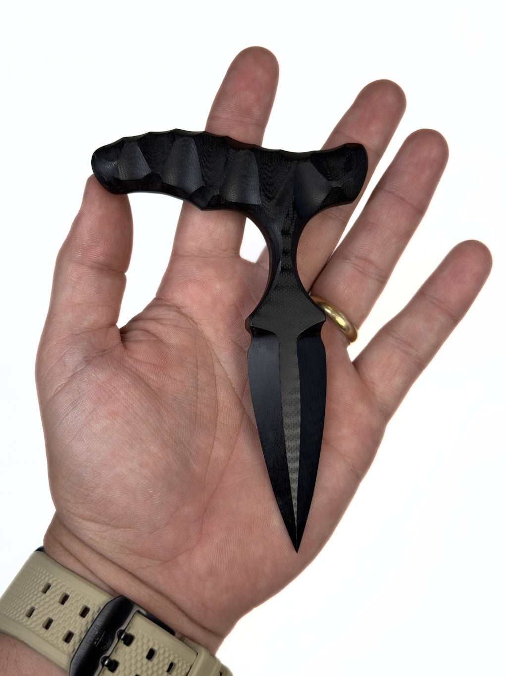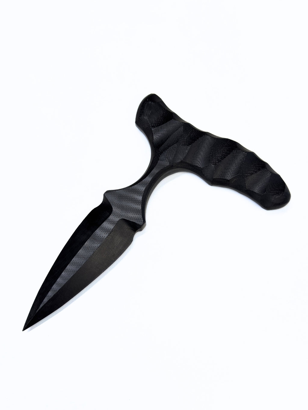 Por este motivo, decidimos retirar essa simetria e centralidade e trazer a lâmina para entre o dedo indicador e o dedo médio. Sua empunhadura agora é assimétrica, com apoio para três dedos abaixo da lâmina, um dedo acima da lâmina e o apoio do dedão — algo que melhorou muito a firmeza e o direcionamento, permitindo uma empunhadura forte e segura, tornando quase impossível de alguém conseguir te desarmar.